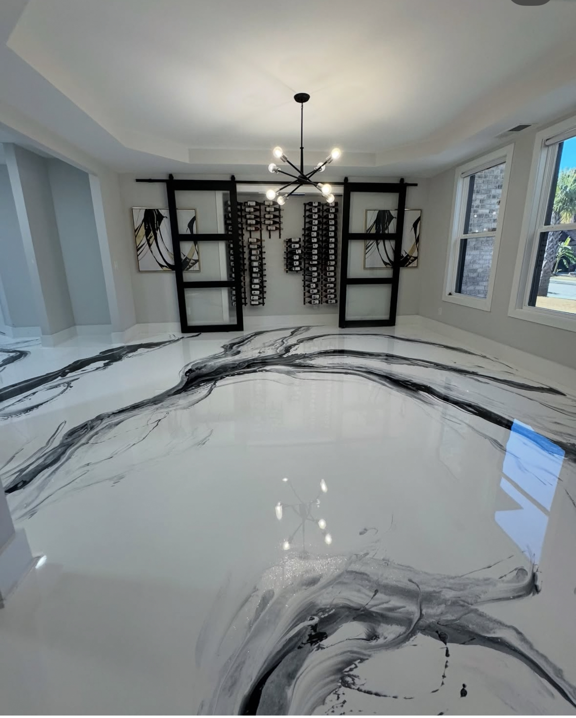 A unique, high-gloss finish with depth and movement that shifts with the light. No two floors look the same. Installed in Kamloops homes, showrooms, and commercial spaces where the floor needs to make an impression.